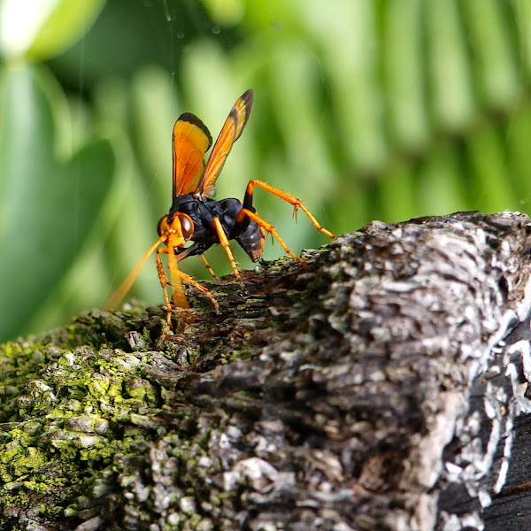 This is a very large black wasp with orange wings and legs and a broad orange band around its abdomen.